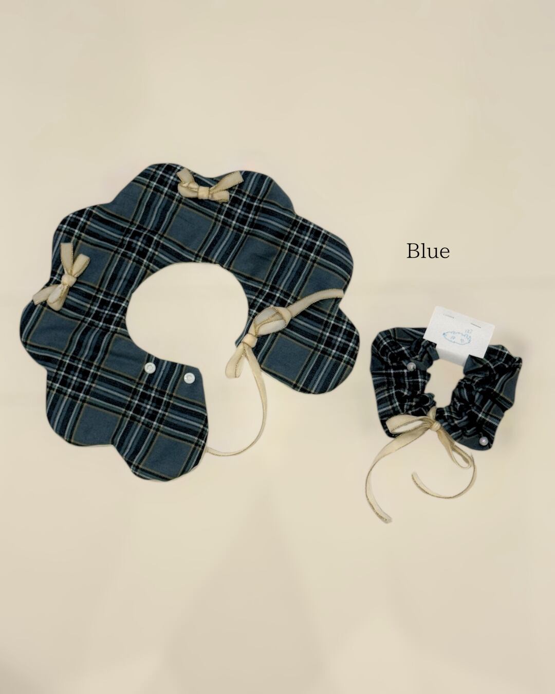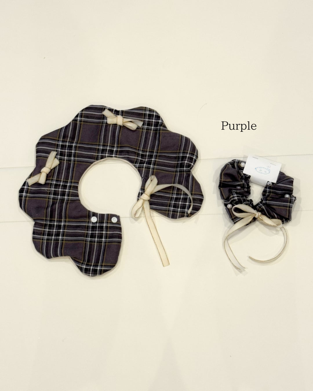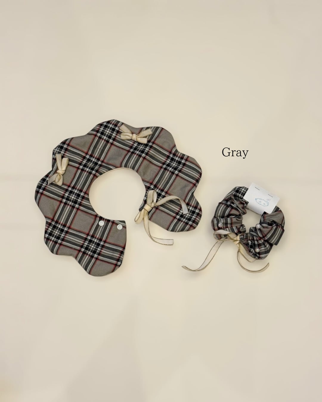 クラシカルなチェック生地に、リボンとパールをあしらい、特別感のあるデザインに仕上げました。