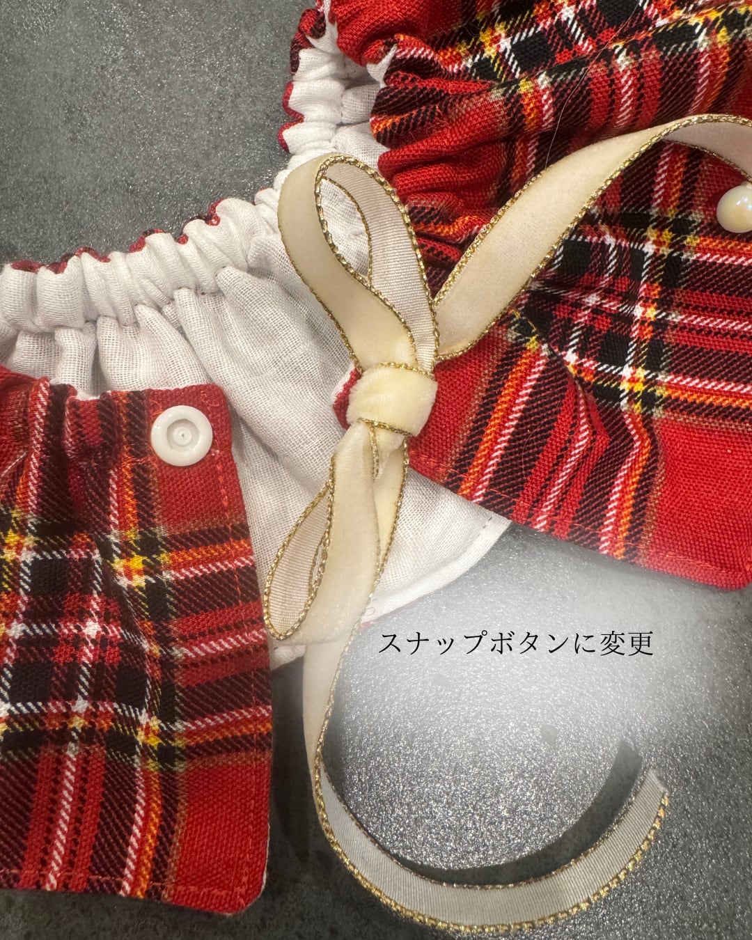 ※頭から被るのが苦手な子には、オプションでスナップボタンタイプへ変更可能です。