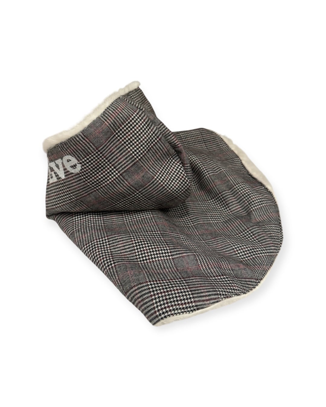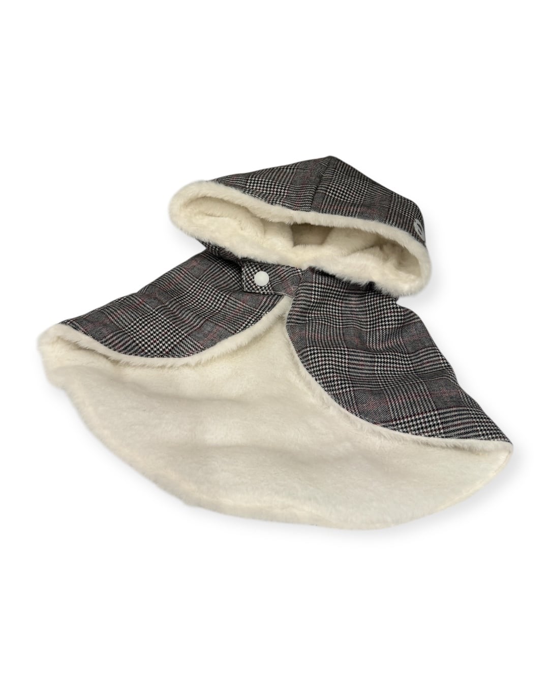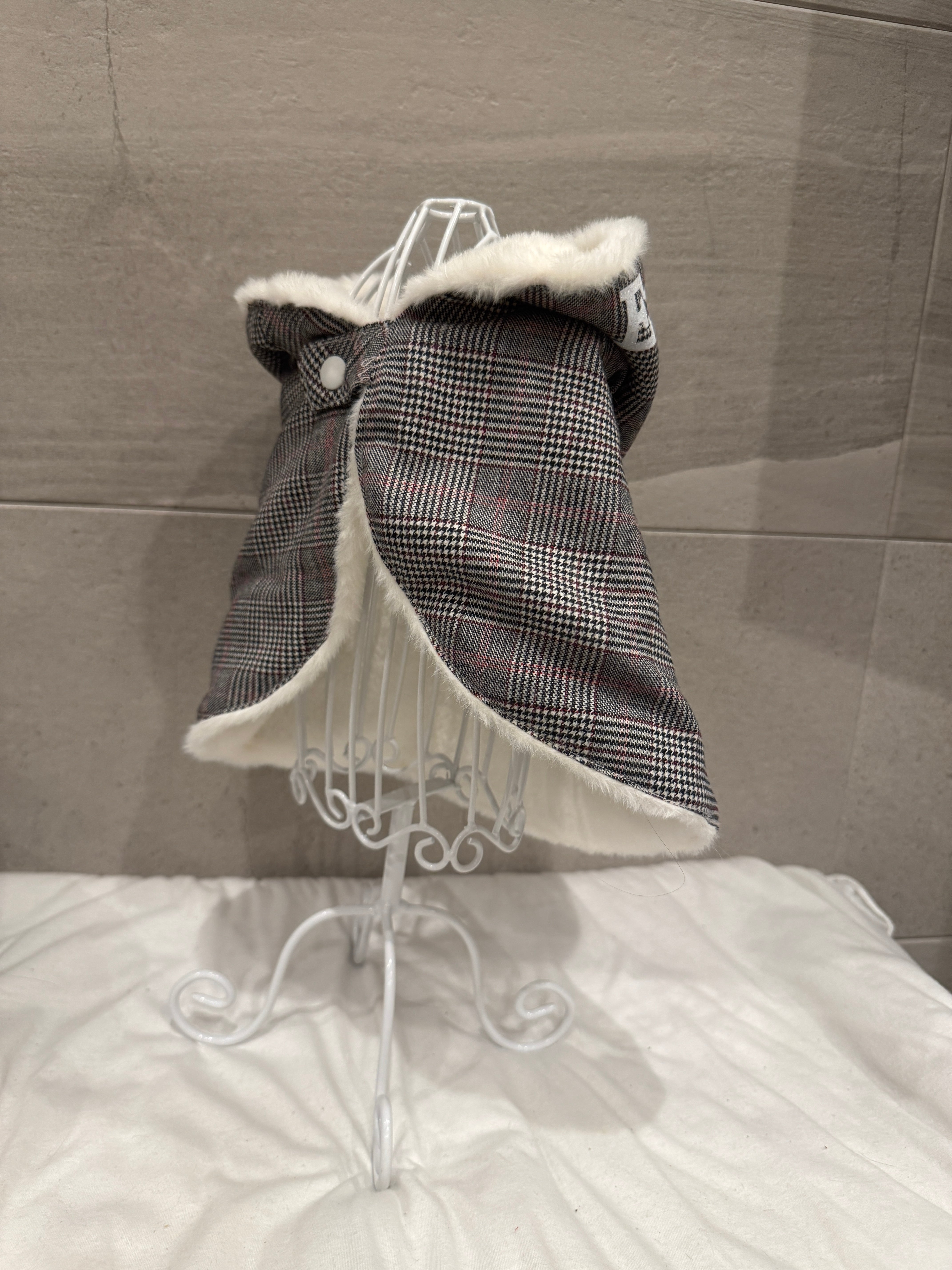 チェック柄の生地と触り心地の良いファーで、リバーシブルで使えるデザインです。